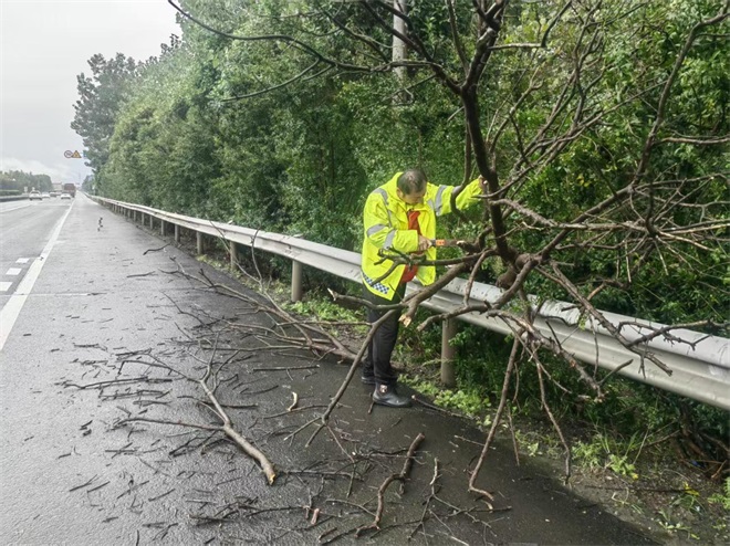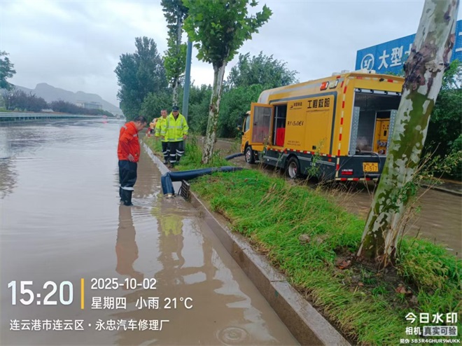 10月2日,大雨突降,公司迅速啟動防汛應(yīng)急預(yù)案,嚴(yán)格落實防汛措施,不分晝夜,連續(xù)對所轄高速公路、國省干線等重點路段及沿線設(shè)施開展隱患排查,確保道路安全暢通。針對G310港城大道、G228新光路等路段積水較多、路邊樹木倒伏等嚴(yán)重情況,公司立即組織橙色突擊隊員、道路養(yǎng)護人員及時清理疏通倒伏樹木、排水溝、雨水井,全力保障排水系統(tǒng)暢通與道路安全,累計出動道路養(yǎng)護人員 90人次、巡查車輛 12臺次,調(diào)配各類機械設(shè)備 14 臺次,清理倒伏樹木20余株。連云港綜合客運樞紐出站口突發(fā)雨水倒灌,公司立即組織應(yīng)急人員協(xié)助連云港站前廣場管理服務(wù)聯(lián)盟調(diào)動水泵排水并引導(dǎo)旅客安全出行。經(jīng)50分鐘緊急處置,積水全部排除,道路恢復(fù)暢通。